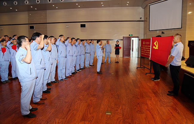 8時25分,大會在莊嚴(yán)的國歌聲中開幕。隨后,8名新黨員面對鮮紅的黨旗,在公司黨委副書記王宏偉的帶領(lǐng)下,舉起右手,莊嚴(yán)宣誓,光榮地加入黨組織的行列;現(xiàn)場全體黨員隨著新黨員一起重溫了入黨誓詞。