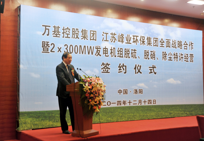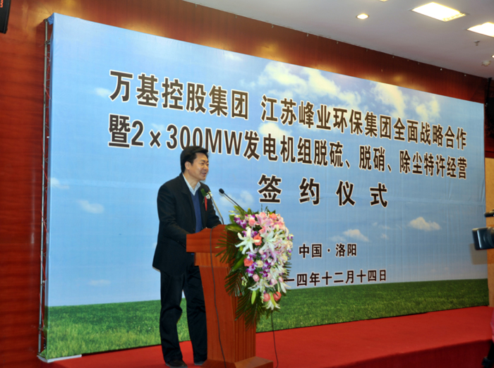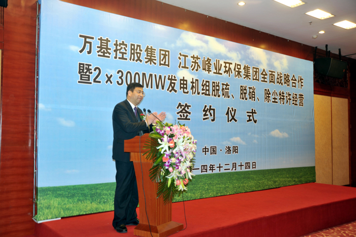 12月14日上午,萬基控股集團與江蘇峰業(yè)科技環(huán)保集團舉行全面戰(zhàn)略合作暨2X30萬千瓦機組脫硫、脫硝、除塵工程特許經(jīng)營簽約儀式,雙方將在發(fā)電機組的脫硫、脫硝、除塵等領(lǐng)域進行合作。江蘇峰業(yè)科技環(huán)保集團邀請出席的領(lǐng)導(dǎo)有中國環(huán)保產(chǎn)業(yè)協(xié)會副會長徐鳳剛、揚州市政府秘書長王逍宵、揚州市經(jīng)信委主任尤在晶、揚州市江都區(qū)常委副區(qū)長增萬忠、揚州市江都區(qū)發(fā)改委主任黃春濤、江都區(qū)高端裝備制造產(chǎn)業(yè)園管委會主任楊曉榮。洛陽市副市長王敬林、洛陽市發(fā)改委副主任王建中、新安縣委書記王玉峰、縣長郅書安、副縣長邵樂毅、縣產(chǎn)業(yè)集聚區(qū)主任樊棟梁、縣發(fā)改委主任李森和公司董事長李躍民、總經(jīng)理郭峰出席簽約儀式。