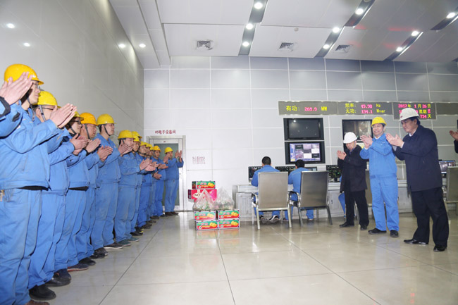 1月26日,縣長(zhǎng)郅書(shū)安帶領(lǐng)四大班子領(lǐng)導(dǎo)到發(fā)電公司慰問(wèn)一線(xiàn)員工,公司董事長(zhǎng)李躍民、總經(jīng)理郭峰等陪同。