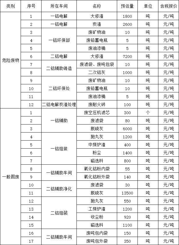 萬基控股集團(tuán)招標(biāo)辦近期將對河南萬基鋁業(yè)股份有限公司的危廢(十二項(xiàng));大修渣、二次鋁灰、炭渣等;一般固廢(十七項(xiàng));噸包袋、中頻爐渣、磁選料等物料進(jìn)行銷售招標(biāo)(下附清單),業(yè)主單位不對該物資的質(zhì)量、用途等做任何承諾,以現(xiàn)場標(biāo)的物現(xiàn)狀為準(zhǔn)。歡迎參與前期實(shí)物勘查。